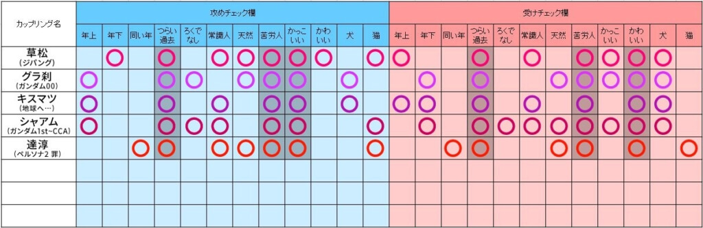 このチェック表、5年前くらいに作ったものらしいんだけど、グラハムも刹那も普通に常識人に◯がついていないのが妙にウケる。ろくでなしに◯つけたのも分かりそうで分からない。